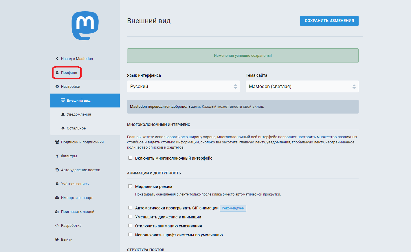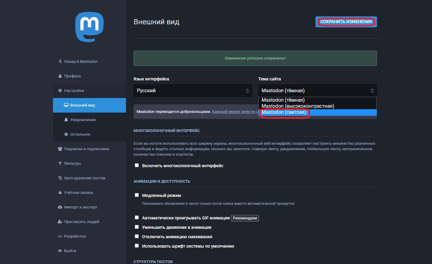 Теперь Мастодон на русском языке! Выберите в настройках светлую тему и нажмите на кнопку Сохранить Изменения: