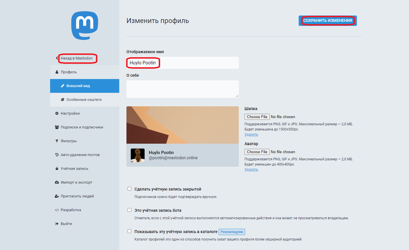 Теперь аватар и шапка выбраны. Введите имя, нажмите кнопку Сохранить Изменения, а затем ссылку Назад в Мастодон: