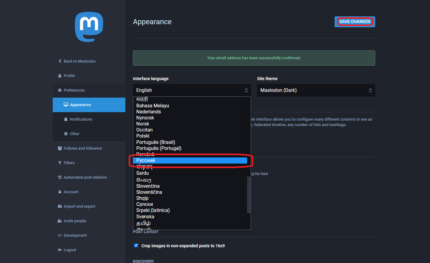 Теперь Мастодон на русском языке! Выберите в настройках светлую тему и нажмите на кнопку Сохранить Изменения: