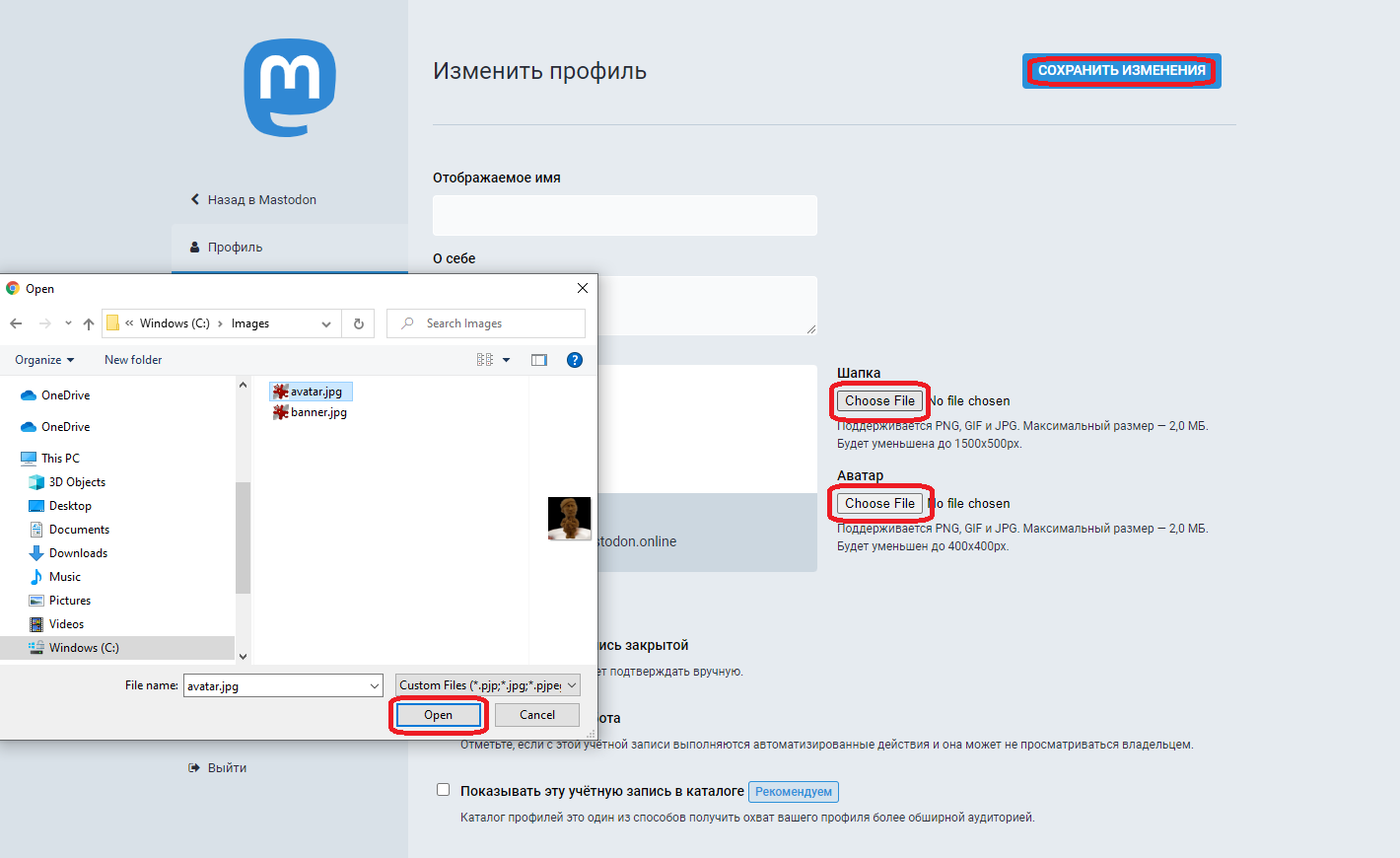 Теперь аватар и шапка выбраны. Введите имя, нажмите кнопку Сохранить Изменения, а затем ссылку Назад в Мастодон: