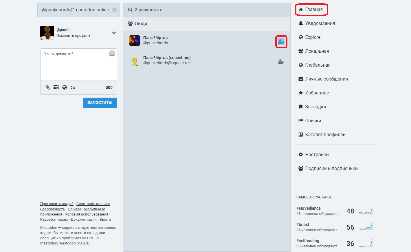 формате @никнейм@сервер. Например: @punkchords@mastodon.online. Нажмие Enter: